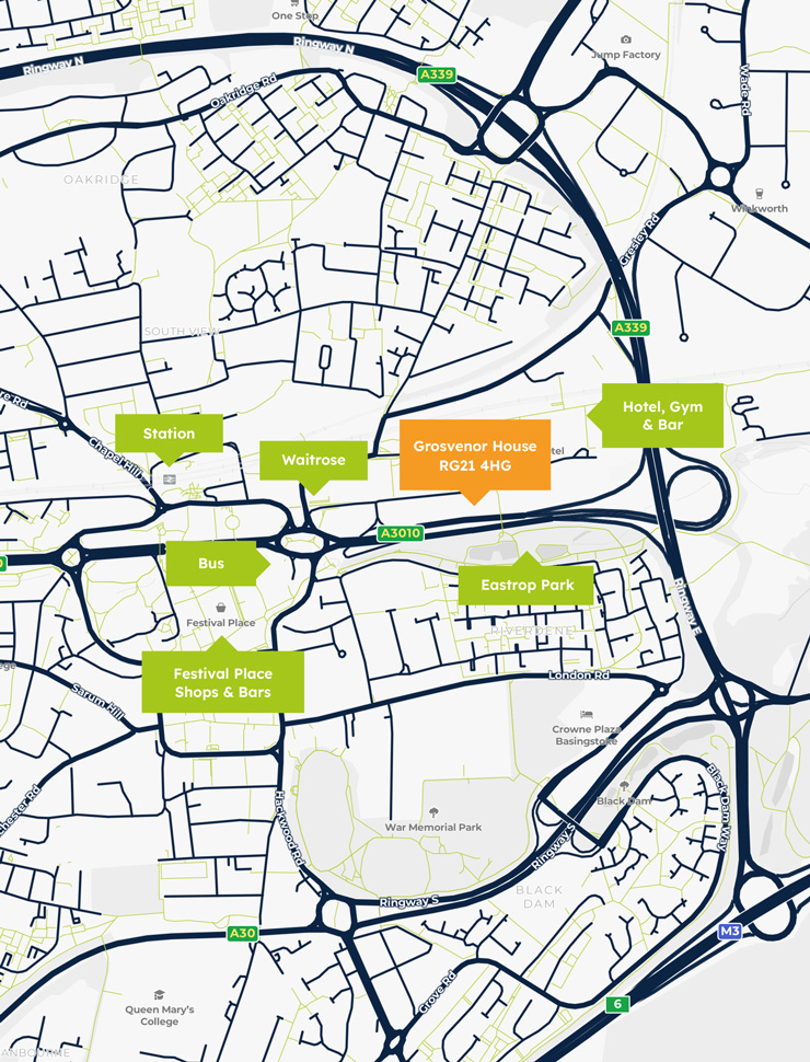 Conveniently located near the M3 with excellent links to London, Grosvenor House is a 5-minute walk from Basingstoke train station. This iconic Basing View building has been newly restored, showcasing award-winning architecture, it spans 45,010 ft², featuring 80 private offices and four state-of-the-art meeting rooms.