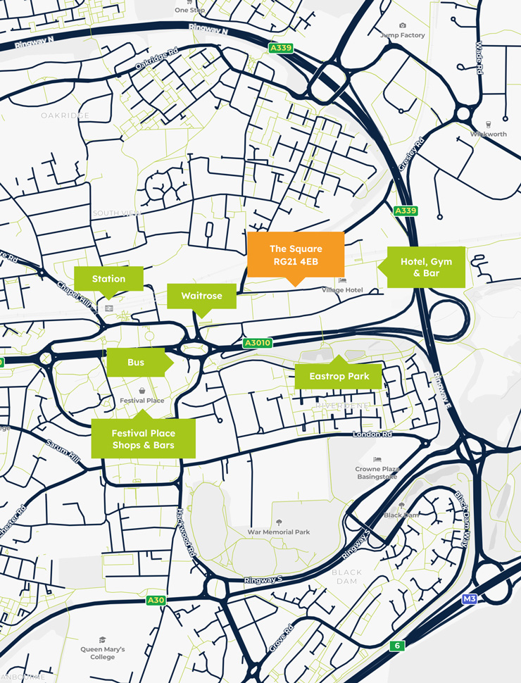 Close to the M3 and a five-minute walk from Basingstoke train station, The Square offers easy access to London and nearby amenities like Waitrose. This modernized 1960s landmark in Basing View spans 37,941 ft² with 56 private offices and three meeting rooms.
