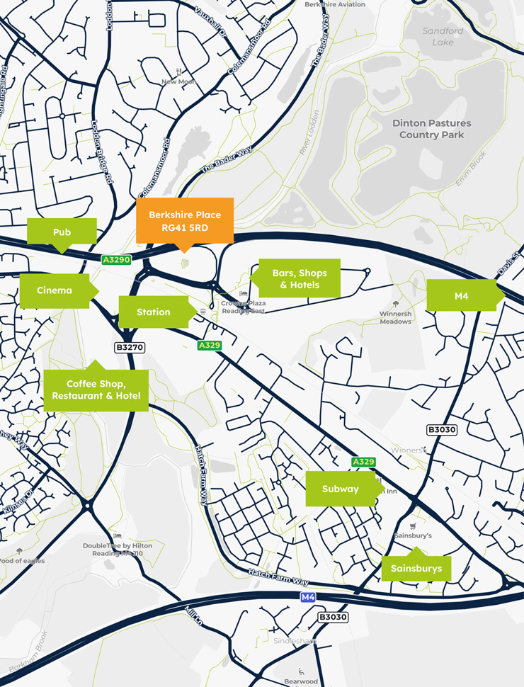 Located in the heart of Winnersh Triangle, opposite the train station, Berkshire Place sits on the A329(M), offering easy access to the M4 and avoiding central Reading traffic. Close to bars, shops, and a cinema, the building spans 50,094 ft² with 102 offices, three meeting rooms, and a penthouse conference suite.