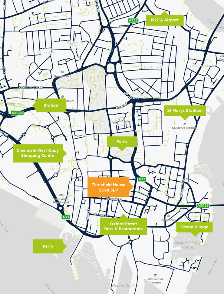 Located near Ocean Village and just a short walk from Oxford Street and West Quay Shopping Centre, Threefield House offers easy access to the heart of Southampton’s city life. The building spans 27,413 ft², featuring 64 offices and two meeting rooms, making it ideal for businesses looking to thrive in a dynamic environment.